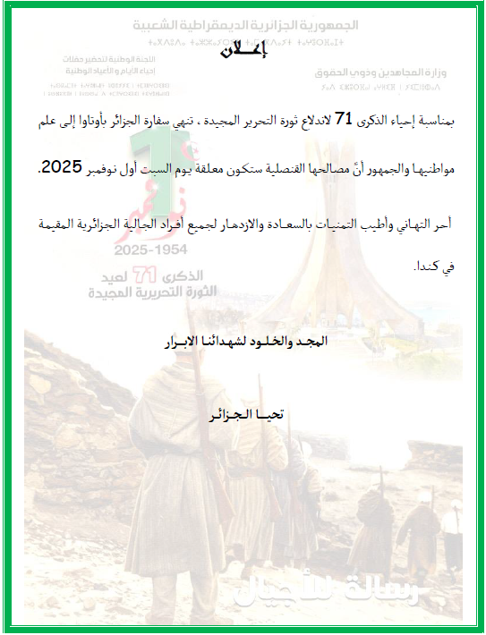 Le public et les membres de la diaspora algérienne sont amicalement invités à visiter la chancellerie algérienne sise à 500 Wilbrod St, Ottawa, ON K1N 6N2.