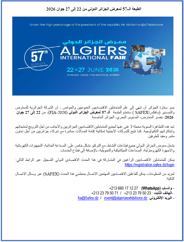 بموجب المرسوم الرئاسي رقم 26-145 المؤرخ في 16 شوال عام 1447 الموافق لـ 04 أفريل 2026، المتضمن استدعاء الهيئة الناخبة لانتخاب أعضاء المجلس الشعبي الوطني يوم الخميس 02 جويلية 2026 و عملا بأحكام الأمر رقم 21-101 المؤرخ 26 رجب عام 1442 الموافق لـ 10 مارس سنة 2021 المتضمن القانون العضوي المتعلق بقانون الانتخابات المعدل والمتمم، لا سيما المادتان 62 و 65 منه، تنهي سفارة الجمهورية الجزائرية الديمقراطية الشعبية بأوتاوا إلى علم أفراد جاليتها المقيمين بدائرة إختصاصها، أنه سيتم إجراء مراجعة استثنائية للقوائم الانتخابية: